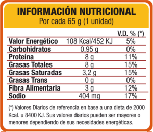 • Ingredientes: Pechuga de pollo deshuesada, agua, CMS (carne mecánicamente separada) de pollo, sal fina, proteína de soja, azúcar, aroma, idé separada) de pollo, sal fina, proteína de soja, azúcar, aroma idéntico ajo y carne, dextrosa, espesante INS 407, antioxidantes INS 300, INS 316,