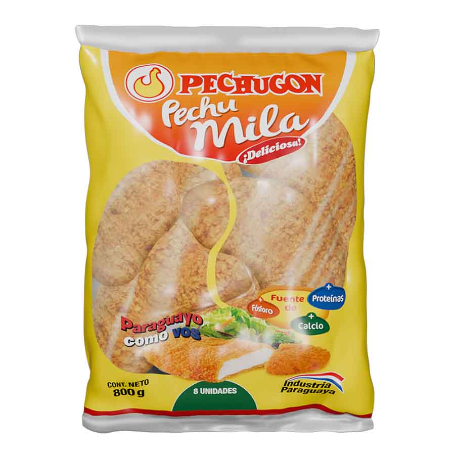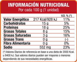 Pechuga Deshuesada de Pollo con piel, carne de pollo mecánicamente separada, agua, aceite de girasol, harina de maíz, harina de trigo enriquecida (hierro y ácido fólico), proteína de soja, almidón de mandioca, sal, almidón de maíz, aroma idéntico al natural: ajo y carne, estabilizante: INS 450i, Espesante: INS 412, antioxidante: INS 300, INS 330, INS 316, colorante natural de cúrcuma, cochinilla y achiote: INS 100, INS 120 y INS 160b.