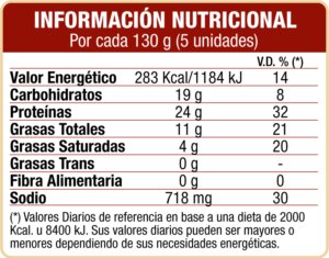 • Pechuga Deshuesada de Pollo con piel, agua, proteína de soja, harina de trigo, almidón de maíz, sal fina, azúcar, aceite de girasol, paprika, cúrcuma, aroma idéntico al natural: ajo y carne, levadura, estabilizante INS 451i, INS 450i y INS 450iii, espesante: INS 407 y INS 412, antioxidante: INS 300, INS 330 y INS 316.